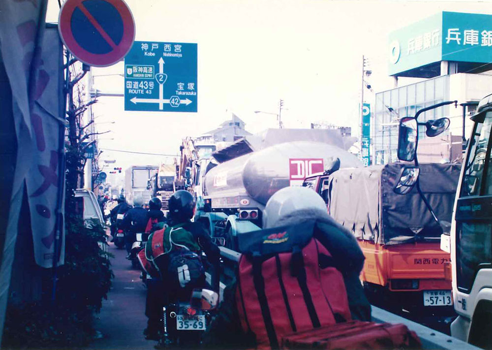 大阪から神戸へ向かう国道2号線、大渋滞の車の横をバイクで、徒歩で、リュックを背負い手荷物を提げて西へ西へと急ぐ若者達。 無言の行列の横には地面を覆う住宅の屋根。 全ての鉄道、電気もガスもダウンした地震直後の週末、大阪からのママチャリで遭遇した感動の光景だった。